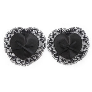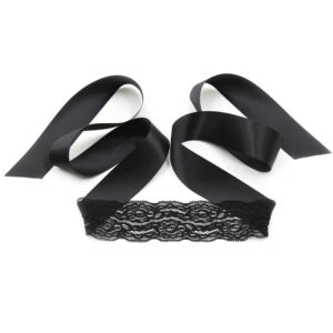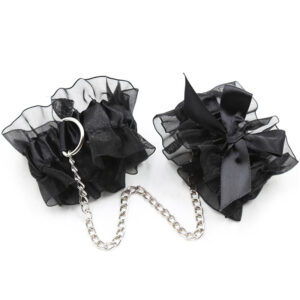 Tenha uma noite ainda mais picante com este conjunto de 3 peças. Possui máscara de seda e renda semitransparente, algemas com renda elástica, unidas por corrente, e protetores de mamilo em forma de coração preto com renda semitransparente.